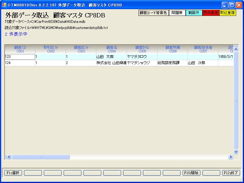 顧客マスタ用のデータをテキストファイル(TABコード区切り)から取込みます。 <操作手順> ①[各種設定2メニュー]-[顧客マスタ設定]で顧客マスタ設定ジョブを起動します。 ②顧客マスタ設定ジョブのメニューの[各種設定]-他データ取込]-[テキスト顧客データ]を選択します。 ![]() ③[F1:選択]でファイル選択画面を表示し取込対象のテキストファイルを選択します。 ![]() ④選択したテキストファイルの情報が一覧画面に表示されます。 ![]() ⑤選択したテキストファイルの 顧客コードのがそのままの値 で取込めない場合があります。 [背景白] テキストファイルの顧客コードの値でデータを取込みます。(取込後のコードは変更されません。) [背景淡青] テキストファイルの顧客コードの値が仕様範囲外の為に新規にコードを取得してデータを取込みます。(取込後のコードは変更されます。) [背景赤] テキストファイルの顧客コードの値が取込先のデータベースに既に存在しています。 この場合は下記の3種類の処理方法から処理を選択します。 ○追加しない 該当データをデータベースに取込みません。 ○新コードを取得して追加する(取込後のコードは変更されます。) ○既存データに上書き(データベースの同一コードのデータは取込むデータに入れ替わります。) [背景黄] テキストファイルの顧客コードに同一の値が存在しています。 この場合は下記の2種類の処理方法から処理を選択します。 ○追加しない 該当データをデータベースに取込みません。 ○新コードを取得して追加する(取込後のコードは変更されます。) ※尚、重複しているデータの内、最初のデータ(背景白)はテキストファイルの顧客コードの値でデータを取込みます。 ![]() <取込可能なテキストファイルの作り方> ※マイクロソフト社 エクセルで作成する場合の例です。 ①レイアウト 1行目にヘッダレコード(項目記号)を2行目以降にデータレコードを作ります。 ※データ内に改行コードやタブコードは入力しないで下さい。 ![]() ②[ファイル]-[名前を付けて保存]で任意のフォルダに ファイルの種類を[テキスト(タブ区切り)] で保存します。 ![]() ③設定できる項目等の詳細な決まり(レイアウト)は下記のPDFファイルを参照して下さい。 cp8dbgetcustlayout.pdf (右クリック-[対象をファイルに保存]) ④サンプルファイル customerdatcp8db.txt (右クリック-[対象をファイルに保存]) |
