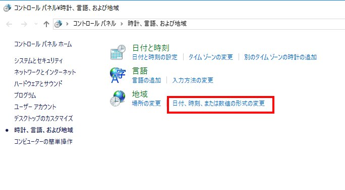 地域の「日付、時刻、または数値の形式の変更」