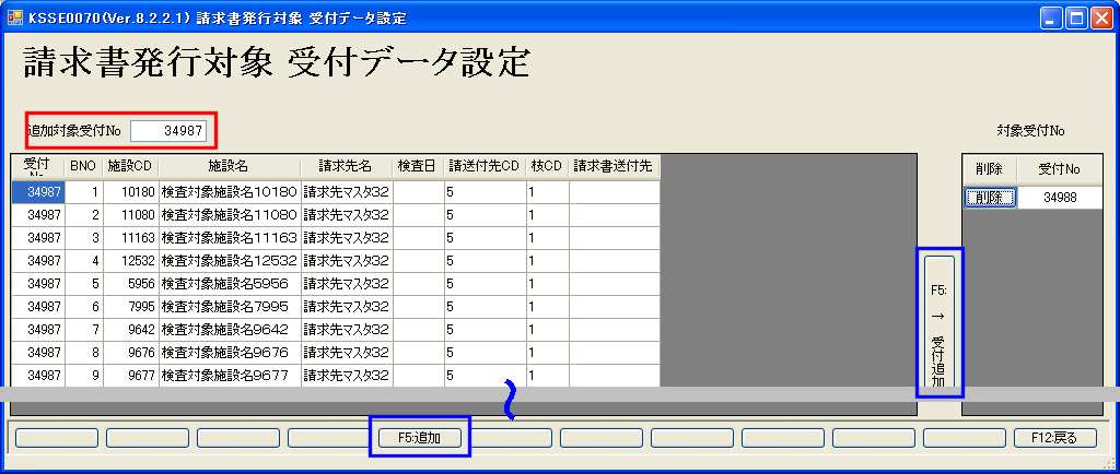 主画面 処理モード ・請求書発行 新規(初)印刷時 ・請求書データ再発行 前回印刷と同内容印刷時 ・請求済データ取消 データを未請求にする場合 単一対象受付No指定 ・処理モードが請求書発行時 受付Noの入力をします ・処理モードが請求書データ再発行時 請求Noを入力します ・処理モードが請求済データ取消時 請求Noを入力します 請求書送付先選択 処理モードが請求書発行時に複数の依頼書送付先が有る場合に依頼書送付先を選択します 選択後、 「F1:抽出」 で選択した依頼書送付先のデータだけが上部の明細部に 対象外になったデータは下部の明細部 (同一受付Noで対象外の受付明細データ) に表示されます 「F3:受付追加」 処理モードが請求書発行時で上部の明細部に対象データが表示されている際にに他の受付Noのデータを追加する事ができます 追加可能なデータは受付No内のデータ全ての依頼書送付先が追加先(上部明細部のデータ)と同じである事が条件です