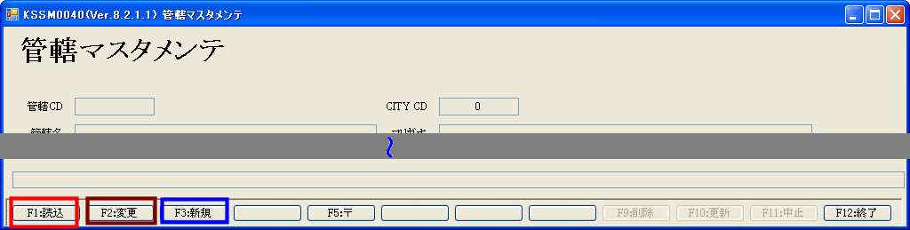 入力したデータは 「F10:更新」 をクリックするまでデータベースに反映しません 「F10:更新」 をクリックすると入力内容のチェック後にデータベース登録します 入力を中止するには 「F11:中止」 をクリックします 新規入力時の場合は入力値は破棄されます 既存データを 削除 する場合は対象データ読込後、 「F2:変更」 をクリックして変更モードにし 「F9:削除」 をクリックすると 削除確認画面 が表示されるので 削除する場合は 「はい」 を 削除しない場合は 「いいえ」 を クリックして下さい |