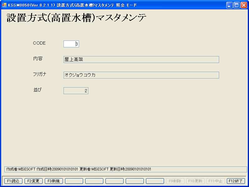 既存のデータを表示する場合は コード に直接コードを入力するか 「F1:読込」 をクリックして 受水槽設置方式マスタ一覧画面 を表示しデータを選択します |